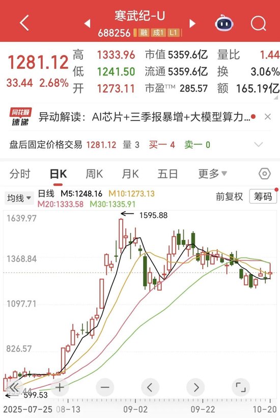 股价方面,10月20日寒武纪盘中最高涨幅达6.92%,随后震荡回落,最终报收1281.12元/股,涨幅2.68%。截至当日收盘,公司市值为5359.6亿元,在半导体板块内排名第二。自8月28日股价达到1595.88元/股后,尚未实现再次突破。